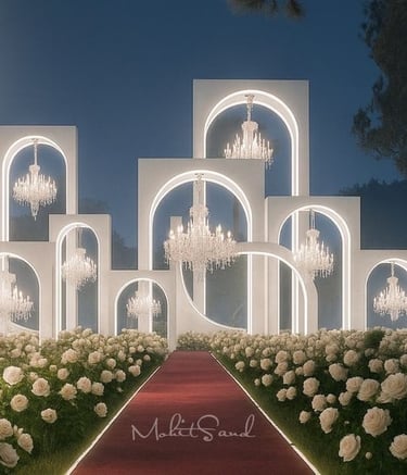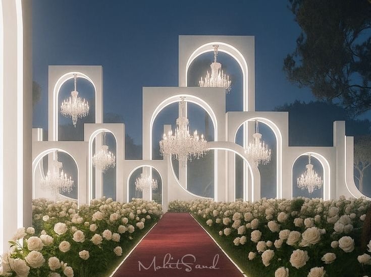 Elegant wedding décor setups including stages, chandeliers, and premium lighting for luxury weddings.